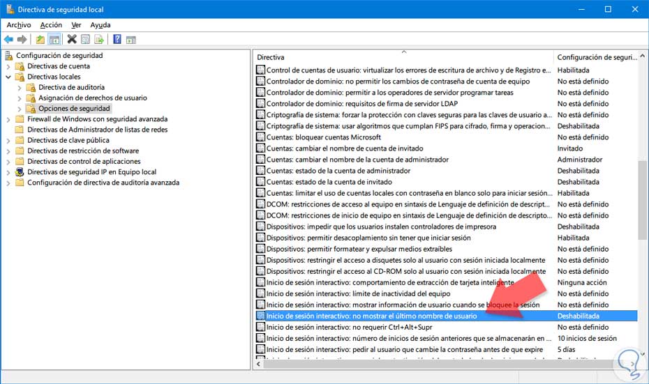 En la lista que aparece en la parte derecha debes de buscar la opción que pone: "opción Inicio de sesión interactivo: no mostrar el último nombre de usuario".