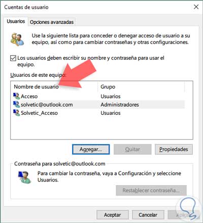 En la ventana desplegada, seleccionamos el usuario al que queremos ver sus propiedades y pulsamos en este botón. Se desplegará la siguiente ventana. En esta ventana vamos a ver el campo Nombre de usuario.