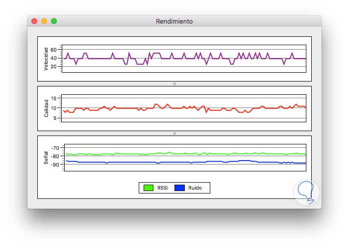 Para obtener acceso a este grafico debemos ejecutar el proceso de diagnóstico inalámbrico como lo mencionamos anteriormente y una vez se haya creado el reporte vamos al menú Ventana y allí elegimos la opción Rendimiento y tendremos un gráfico en tiempo real donde veremos estos conceptos sobre el estado actual de la red divido en dos secciones (Ruido y RSSI):