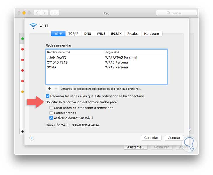 Esta opción permite habilitar que macOS Sierra permanezca en contacto con el router y para ello habilitaremos la opción de que sea solicitada la contraseña de administrador al intentar conectarnos o desconectarnos de la red Wi-Fi.