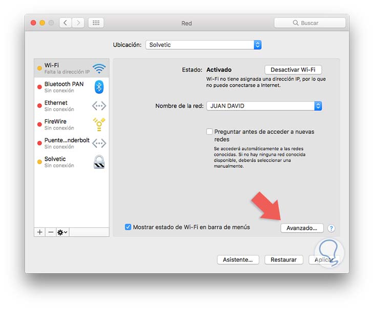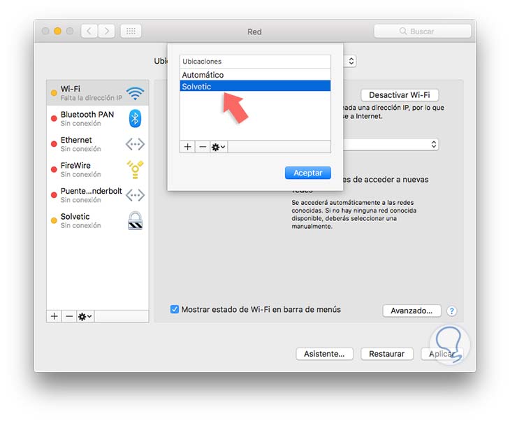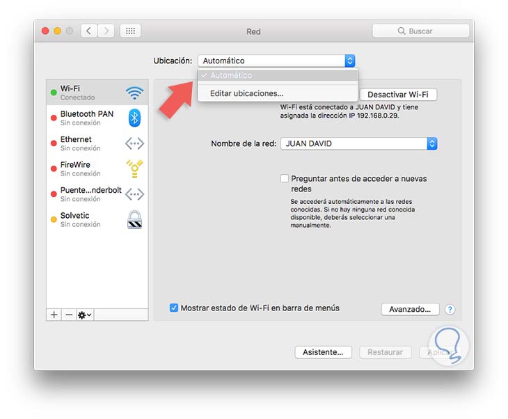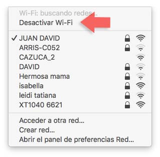 El primer paso es cerrar cualquier aplicación que esté usando los servicios de red tal como algún navegador web, correos, etc. Lo siguiente que debemos hacer es desactivar la red WiFi actual pulsando sobre el ícono de WiFi ubicado en la parte superior y en las opciones desplegadas elegir Desactivar WiFi