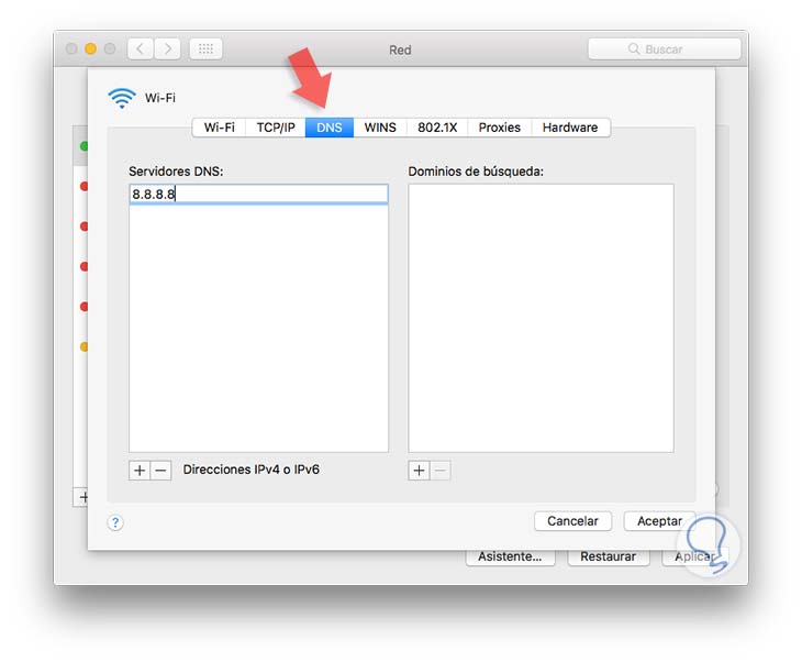 Posteriormente vamos a la pestaña DNS y pulsamos en el ícono + y podemos agregar las siguientes direcciones IP: 8.8.8.8 y 8.8.4.4 las cuales son de Google y pueden ser usadas de forma gratuita como servidores de DNS.