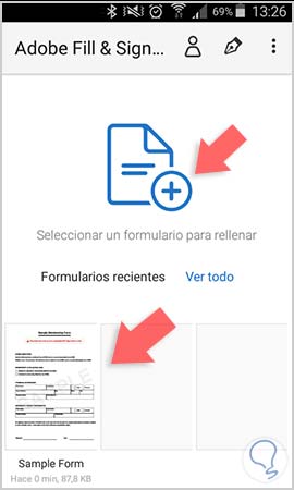 Una vez que tenemos descargada la app, procedemos a abrirla y en la pestaña principal nos vamos a encontrar con una pestaña para subir nuestro documento a fimar o formulario a rellenar. En el caso de que tengamos ya alguno, aparecerá en la parte inferior.