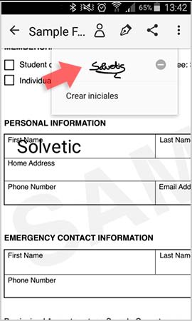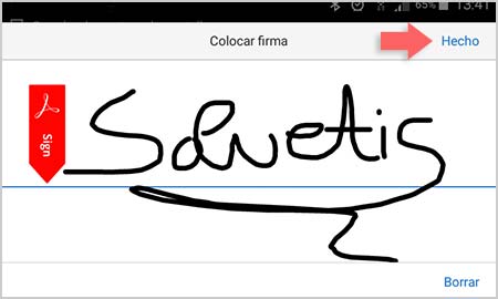 Si seleccionamos “crear firma” veremos como aparece una nueva pantalla en la que vamos a poder realizar con el propio dedo nuestra firma. Une realizada, seleccionamos el botón de “Hecho”