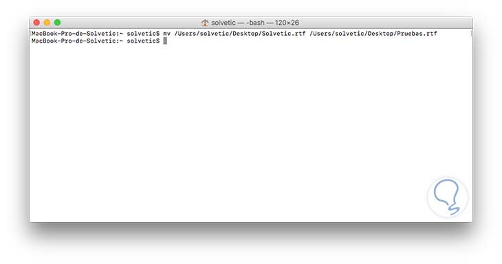 mv Ruta_Archivo Ruta_ModificadaEn este caso modificaremos el archivo rtf llamado Solvetic. Ingresamos los parámetros en la terminal y podemos ver que el archivo ha sido renombrado, en este caso de Solvetic a Pruebas