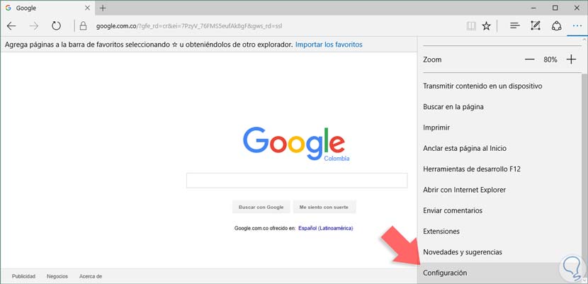 Para ello vamos al menú de Microsoft Edge y seleccionamos la opción Configuración.