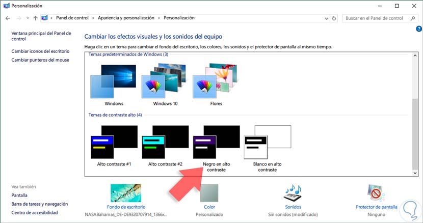 Allí nos desplazamos al final de la ventana y elegimos la opción Negro en alto contraste y podemos ver los cambios en el explorador de archivos y otras aplicaciones.