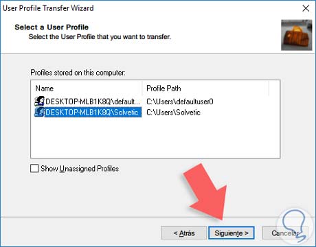 En nuestro ejemplo usaremos la primera opción y veremos lo siguiente. Allí seleccionamos a cuál o cuáles usuarios hemos de transferir el perfil, una vez realizado pulsamos Siguiente y veremos la siguiente ventana.