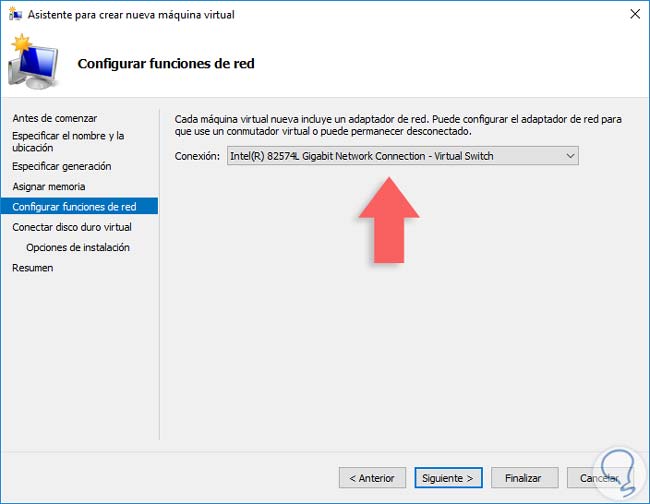 De nuevo pulsamos Siguiente y a continuación configuramos los parámetros de red, en este caso podemos dejar sin ningún adaptador o vincular el adaptador físico de Windows Server 2016.