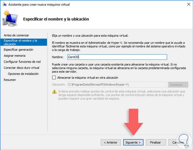 Pulsamos Siguiente y en la ventana desplegada debemos indicar el nombre de la máquina a crear y la ubicación donde la guardaremos.