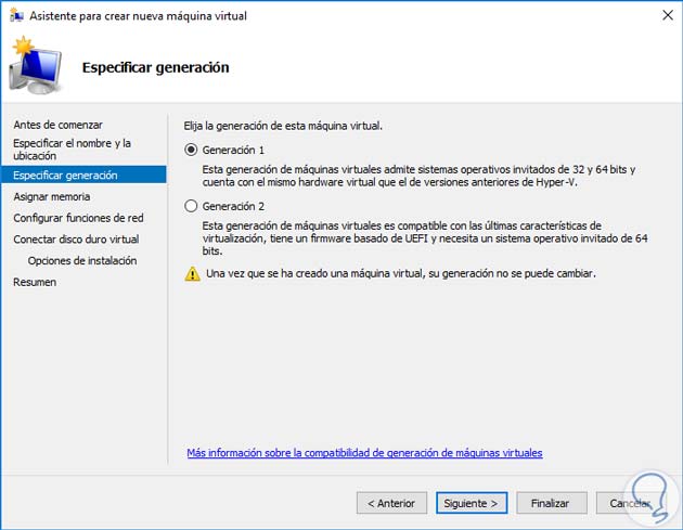 Pulsamos Siguiente de nuevo y a continuación debemos especificar la generación que asignaremos a la máquina virtual, recordemos que existen dos tipos de generaciones: