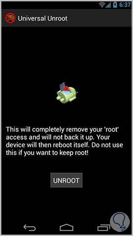 Allí pulsamos el botón UNROOT para iniciar el proceso de eliminación del usuario root. Veremos el siguiente mensaje donde debemos confirmar el proceso.