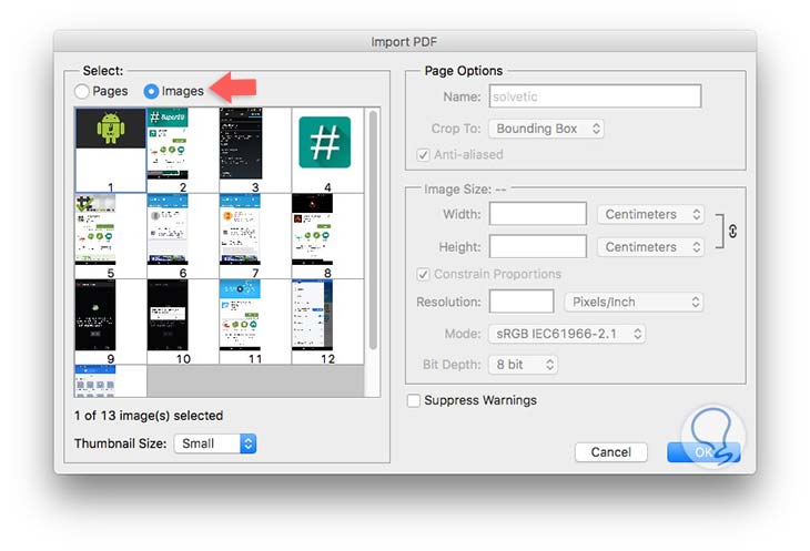 Para ello debemos abrir el PDF desde la propia aplicación y seleccionar la página o páginas desde las que queremos extraer esta imagen. Una vez seleccionada, tenemos que pulsar sobre la parte donde dice “imágenes”. Cuando le demos a aceptar la imagen aparecerá dentro del editor sin ningún tipo de texto.