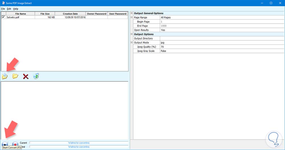 Para ello una vez que nos hemos descargado la aplicación debemos abrir el programa y seleccionar la carpeta situada en el lateral derecho para adjuntar el archivo PDF que seleccionemos. Una vez seleccionado, debemos hacer clic en la parte inferior sobre el botón de “Start convert” para que comience el proceso.