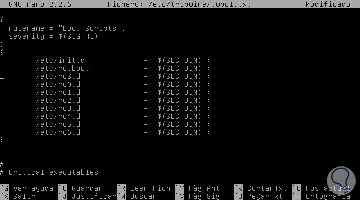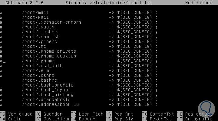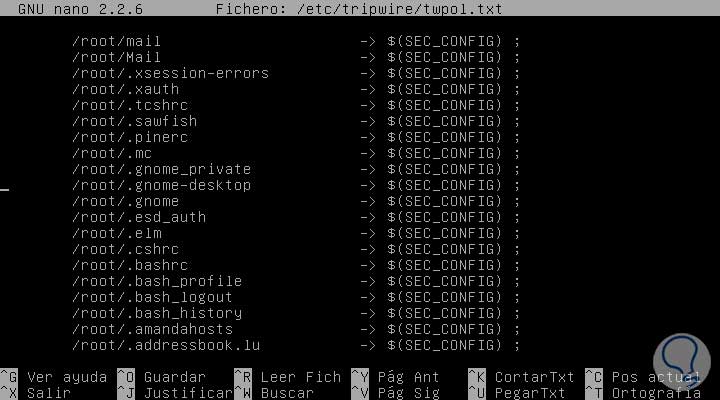 sudo nano /etc/tripwire/twpol.txtSe desplegará la siguiente ventana: