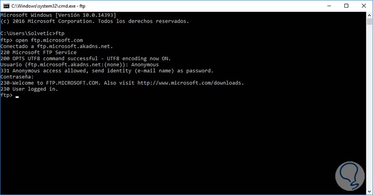 Una vez abierta la terminal ingresaremos el término ftp y pulsamos Enter, posteriormente ingresaremos la siguiente línea: