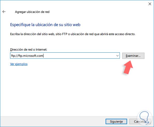 Una vez seleccionada esta opción pulsamos Siguiente y debemos ingresar la ruta del servidor ftp a conectarnos, recordemos que siempre debe iniciar como ftp. En este ejemplo nos conectaremos al ftp de Microsoft ya que es de acceso libre y la ruta es la siguiente.