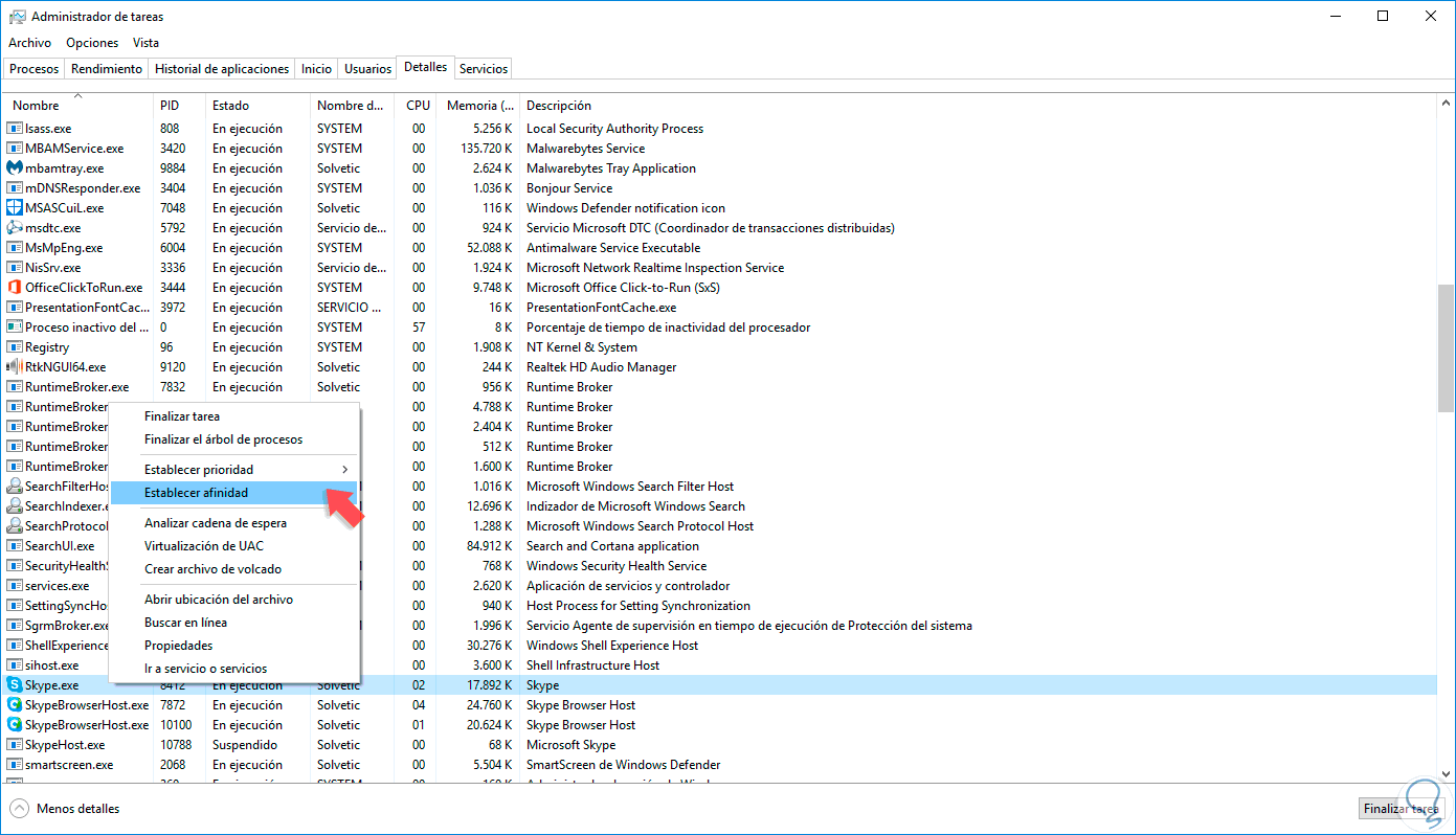 Estamos ahora dentro de la categoría de Detalles y seleccionada la línea en la que aparece el programa que hemos elegido. Ahora debes hacer clic derecho sobre él y pulsar en “Establecer afinidad”.