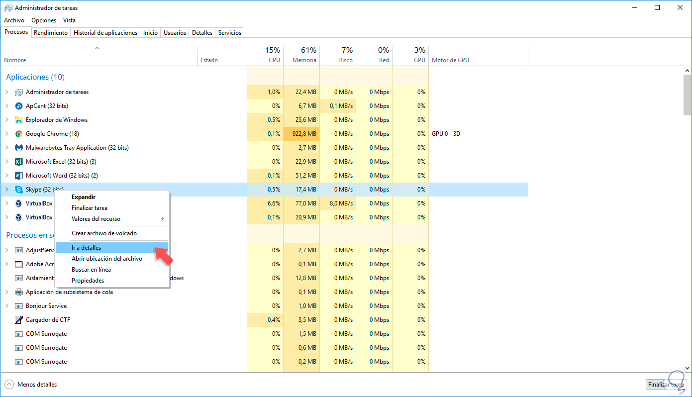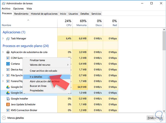 Ahora debemos ir a “Procesos” y ahí elegimos la aplicación a la que queremos definir una prioridad. Para ello haz clic derecho sobre ella y elige “Ir a detalles”.
