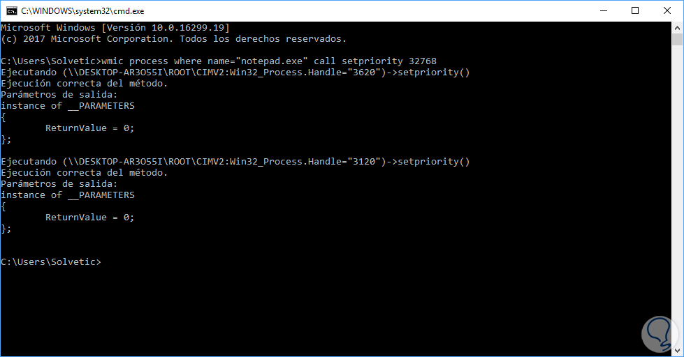 Ejecutamos el siguiente modelo de sintaxis en función de la preferencia. Debes colocar el nombre del proceso y en nivel de prioridad colocar el número que prefieras como vemos a continuación.