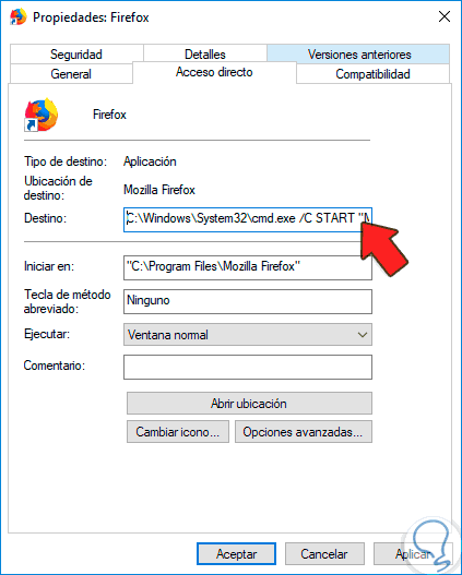 Aquí tenemos que entrar en la opción de Destino y modificaremos la ruta que aparece añadiendo la siguiente sintaxis de esta forma: