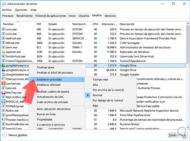 Cuando trabajamos en Windows 10 sabemos que muchos servicios están siendo ejecutados tanto en primer como en segundo plano y esto puede afectar el rendimiento de los recursos de hardware del sistema. Hay que saber cómo optimizar nuestro Sistema Operativo para que no nos de problemas mientras trabajamos con él o acabe dañándose. En los Sistemas Operativos Windows 7, 8 o 10 los procesos que están siendo ejecutados tiene una prioridad asignada para que el procesador ejecute más rápido dicho proceso y aquellos que poseen una prioridad alta indiscutiblemente tendrán más procesador dedicado para su fin. Quizás nos encontremos la cuestión de ¿Qué pestaña se utilizaría para establecer la prioridad de un proceso en el administrador de tareas de Windows 10? y necesitemos hacer una configuración del nivel de prioridad. Es normal por ejemplo estar jugando y querer saber como dar prioridad a un juego para que se destinen a él más recursos del sistema.