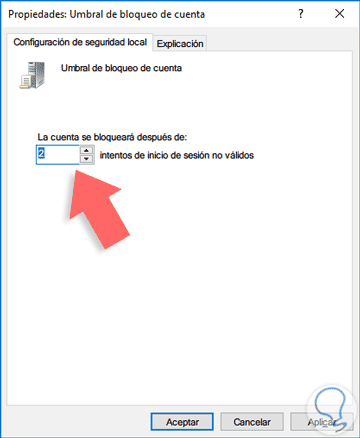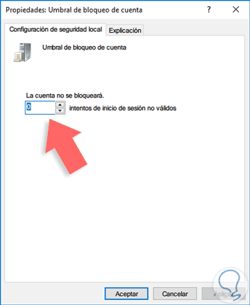 Allí indicamos la cantidad de intentos y pulsamos Aplicar y luego Aceptar para guardar los cambios.