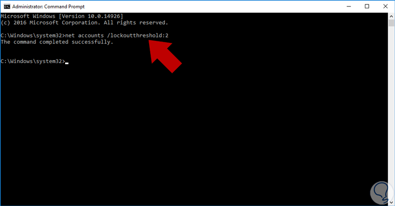 El siguiente paso consiste en definir el número de intentos posibles antes de ser bloqueada la cuenta en Windows 10, para ello usaremos el siguiente comando: