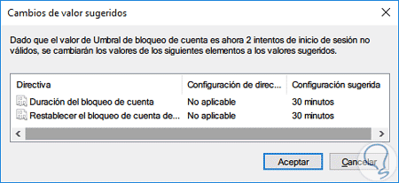 Una vez pulsamos Aplicar veremos el siguiente mensaje donde Windows de manera automática configura los parámetros de la duración del bloqueo en 30 minutos.