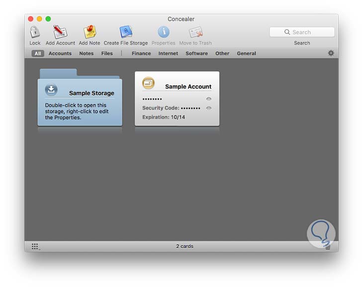 Allí podemos usar la opción Sample Storage para agregar archivos y protegerlos, o usar las opciones desplegadas en la parte superior como Account, Files, Finance para agregar otro tipo de elementos a la herramienta.