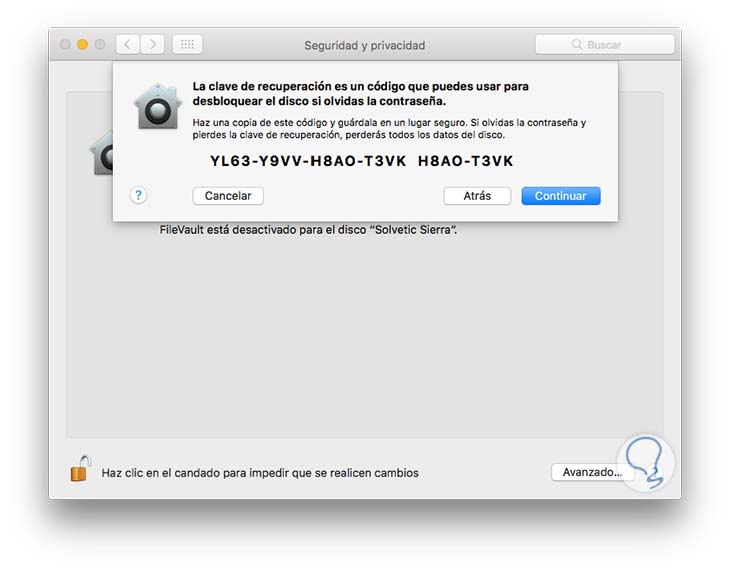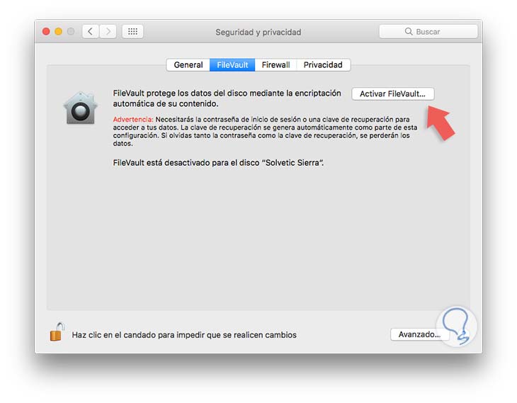 En caso que perdamos nuestra contraseña los datos quedarán encriptados de manera continua, de ahí la importancia de saber muy buen nuestra clave de acceso. Para implementar FileVault en Mac OS Sierra realizaremos el siguiente proceso.