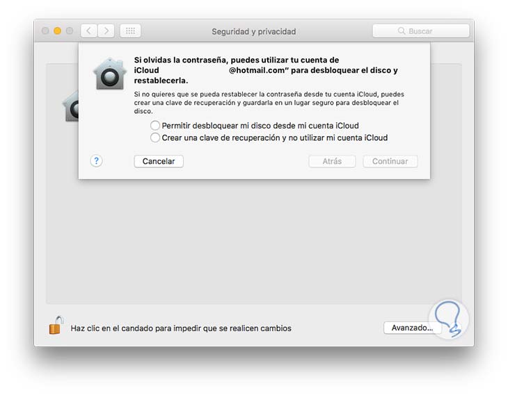 Una vez pulsado este botón veremos el siguiente mensaje donde podemos definir si podremos desbloquear nuestro sistema usando iCloud o creando una clave de recuperación.