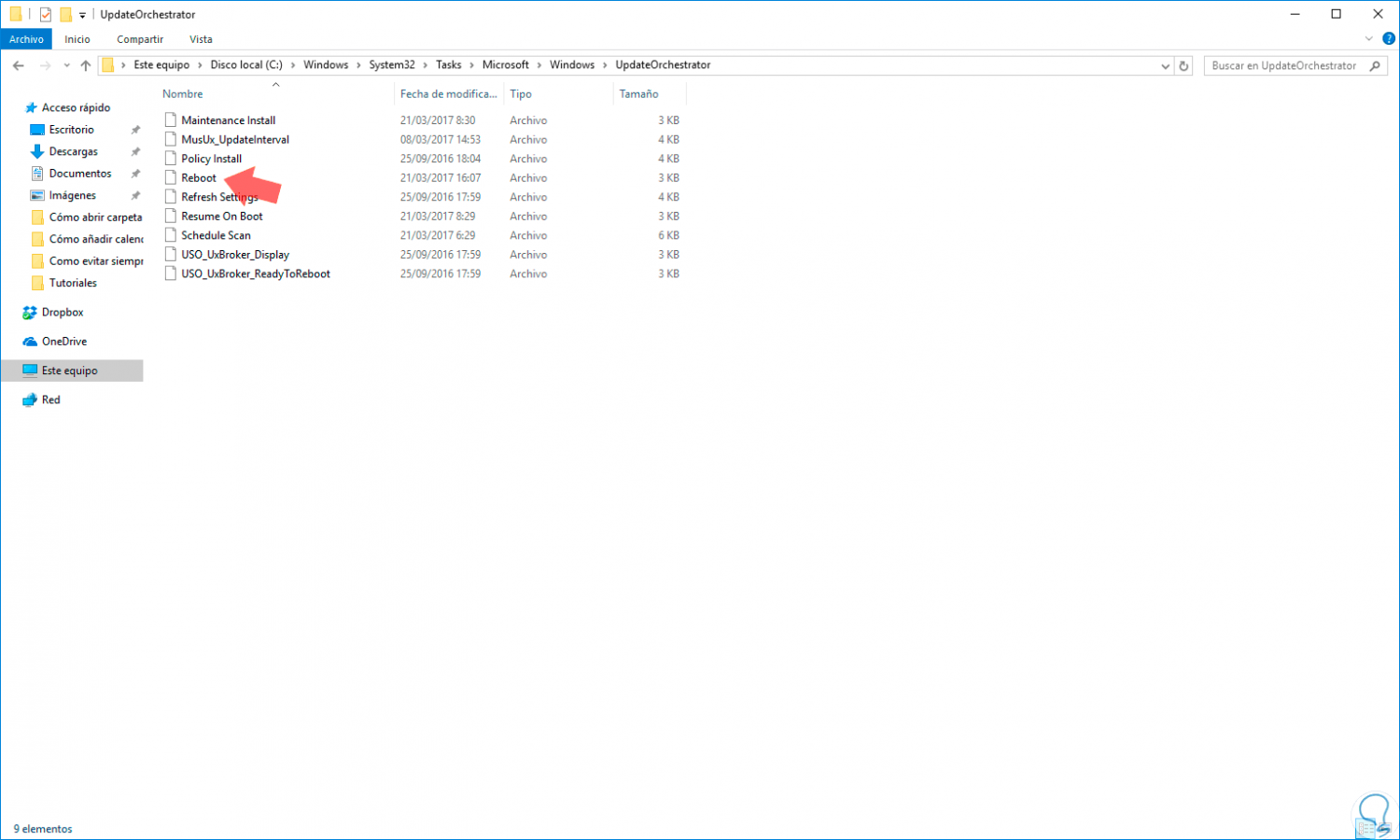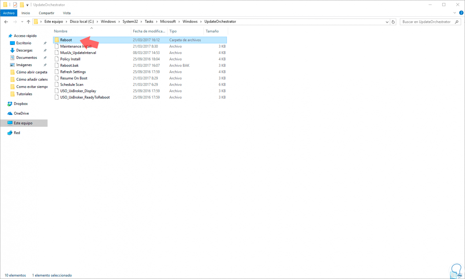 Esto evita que Windows 10 cree de nuevo la tarea de reinicio. Si en algún momento deseamos que todo este como antes basta con eliminar la carpeta Reboot y renombrar el archivo de nuevo sin la extensión .bak.