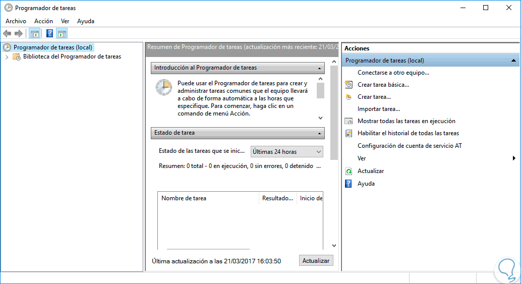 En primer lugar será necesario crear una tarea sencilla y para ello podemos acceder al programador de tareas usando alguna de las siguientes opciones: