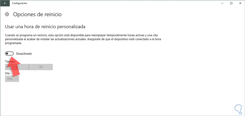 Allí debemos pulsar el botón Desactivado para que pase al estado Activado y de esta manera poder definir el horario en el cual Windows 10 se reiniciará e instalará las actualizaciones más recientes del sistema. Usando esta opción podemos definir un día específico para dicha tarea.