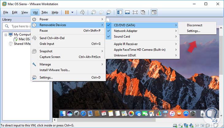 El siguiente paso consiste en incluir en nuestra máquina virtual de macOS Sierra los complementos o herramientas de VMware que nos permitirán interactuar con el equipo anfitrión para compartir archivos, hardware y en general todas las ventajas de usar una máquina virtual. Para habilitar esto debemos ir al menú VM y seleccionar la opción