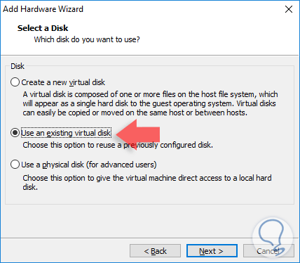 Pulsamos Next y en la siguiente ventana seleccionamos la casilla Use an existing virtual disk