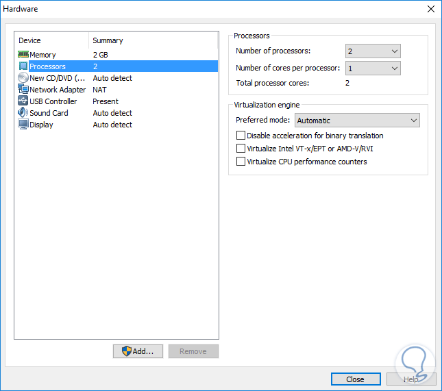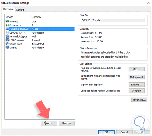 Allí debemos seleccionar la línea Edit virtual machine settings para realizar el proceso de adición del disco duro virtual. En este caso seleccionamos la línea Hard Disk y pulsamos el botón Remove ubicado en la parte inferior para eliminar este disco y poder crear uno nuevo con el que hemos descargado.