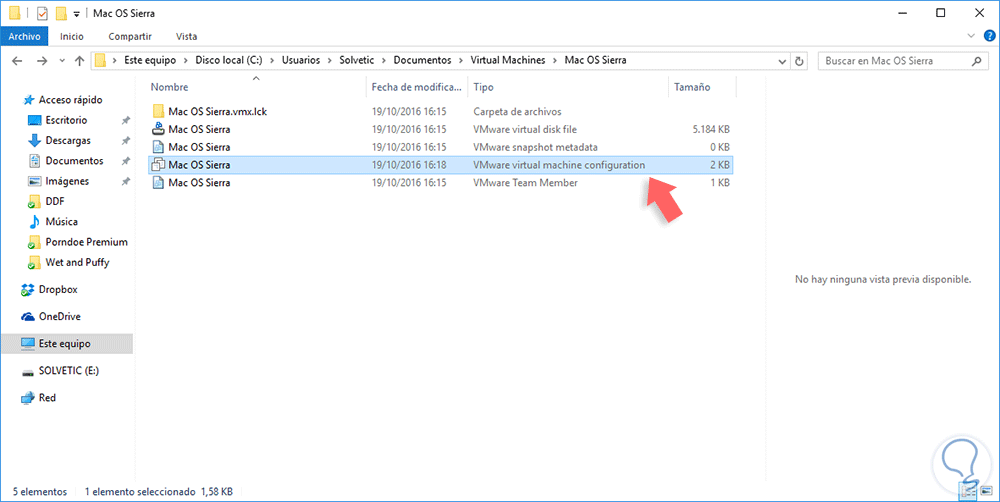 Una vez hemos completado las anteriores configuraciones debemos ir a la ruta donde hemos almacenado los archivos de la máquina virtual y allí ubicamos el archivo de configuración de la máquina el cual podemos validar en la columna Tipo con el nombre VMware virtual machine configuration