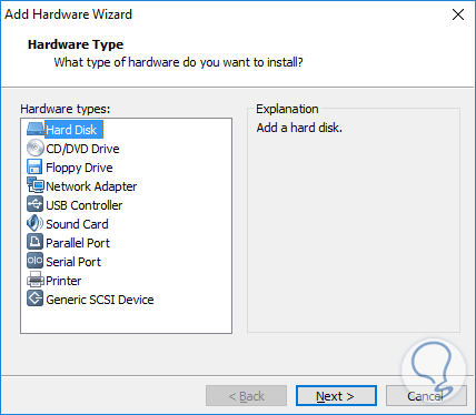A continuación pulsamos el botón Add para crear el nuevo disco duro y veremos que se despliega el siguiente asistente donde seleccionamos Hard Disk