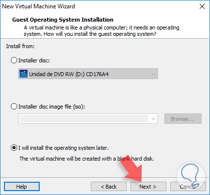 En la siguiente ventana activamos la casilla I will install the operating system later para indicar que el sistema operativo (disco virtual de Mac OS Sierra) será instalada más adelante.