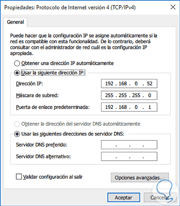 Si hemos observado teníamos la dirección IP 192.168.0.35 asignada por DHCP (Dinámica), al momento de ejecutar el comando podemos ver usando las propiedades de IPv4 que la dirección se ha modificado según lo indicado: 192.168.0.52 y estática.