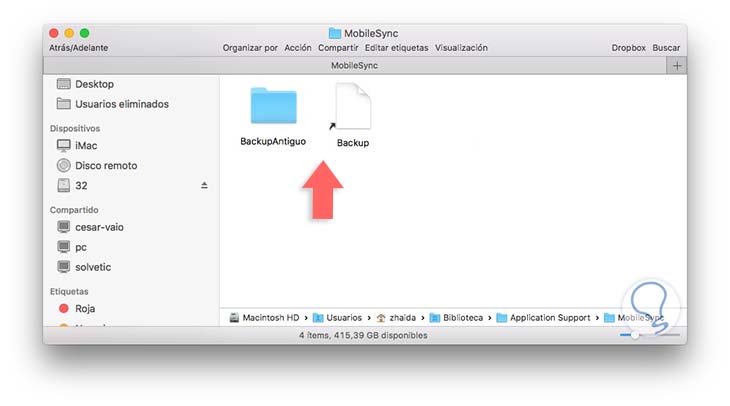 ~/Library/Application Support/MobileSync/Ahora debemos comprobar que es un archivo genérico con una flecha en el, lo que significa que ahora mismo hay una relación directa entre “Copia de seguridad” y la ubicación específica en el disco duro externo.