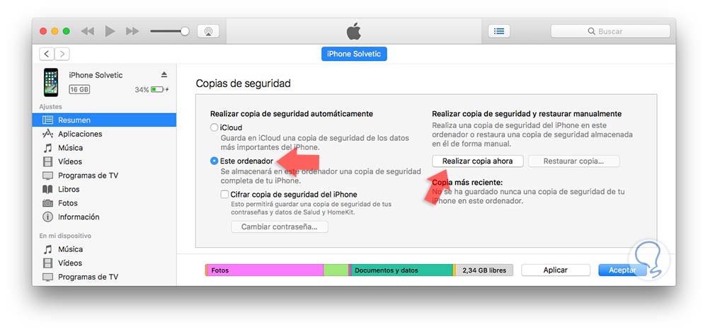 Lo siguiente que debemos hacer a continuación es abrir iTunes y conectar nuestro iPhone o iPad al ordenador. Una vez aquí debemos seleccionar “Este ordenador” para comenzar con la copia de seguridad. (Podemos encriptarla de manera opcional). Seleccionamos por último “Realizar copia ahora” y se iniciará el proceso.