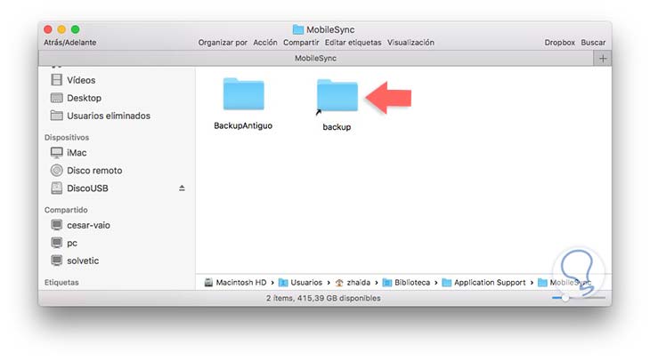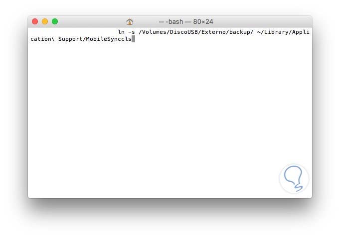 ln -s /Volumes/DiscoUSB/Externo/Backup/~/Library/Application\ Support/MobileSyncDebes tener en cuenta que tienes que cambiar el nombre de la unidad externa (en nuestro caso discoUSB ) y la ruta de la carpeta que hemos creado (en nuestro caso Externo/backup). Se debe modificar según los nombres que tu hayas asignado al dispositivo externo y a la carpeta dedicada al backup.