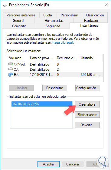 Las instantáneas de volumen requieren de NTFS por lo cual podremos crear instantáneas en volúmenes locales y externos.