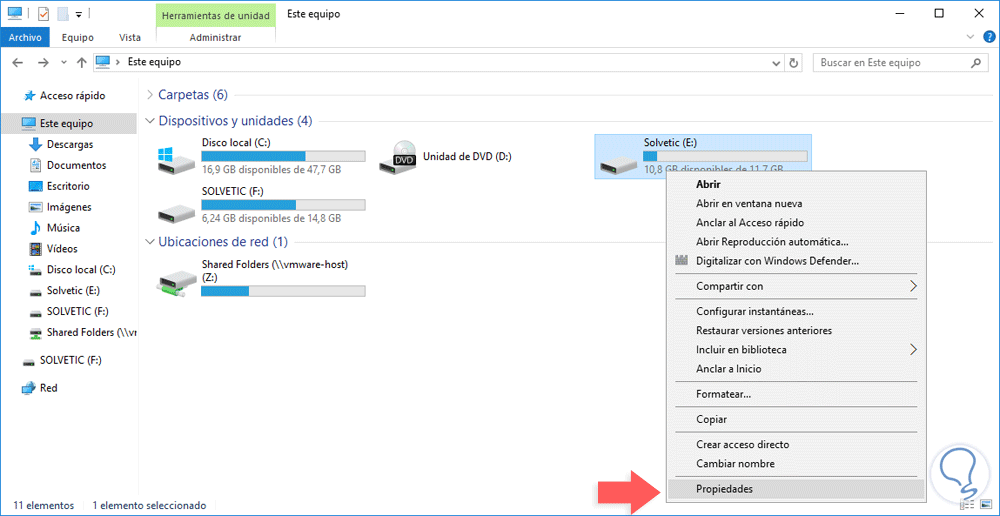 Para iniciar el proceso vamos a ir al volumen donde se habilitará la instantánea, en este caso será la unidad E, y allí pulsamos clic derecho y seleccionamos la opción Propiedades.