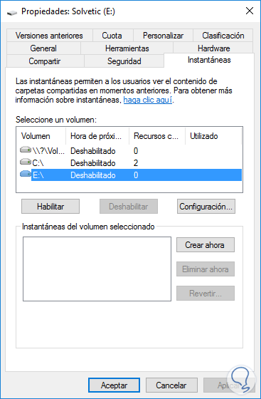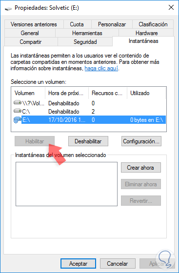 Una vez definamos los parámetros necesarios pulsamos el botón Habilitar para activar la instantánea en el volumen seleccionado.