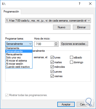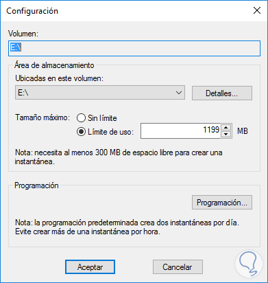 Recordemos que el tamaño de la instantánea está basado a la información que tengamos en el volumen. Si pulsamos la opción Programación podemos observar que contamos con múltiples alternativas para la toma de las instantáneas tales como día y hora, frecuencia de la copia (diaria, semanal, mensual, al iniciar sesión, etc).