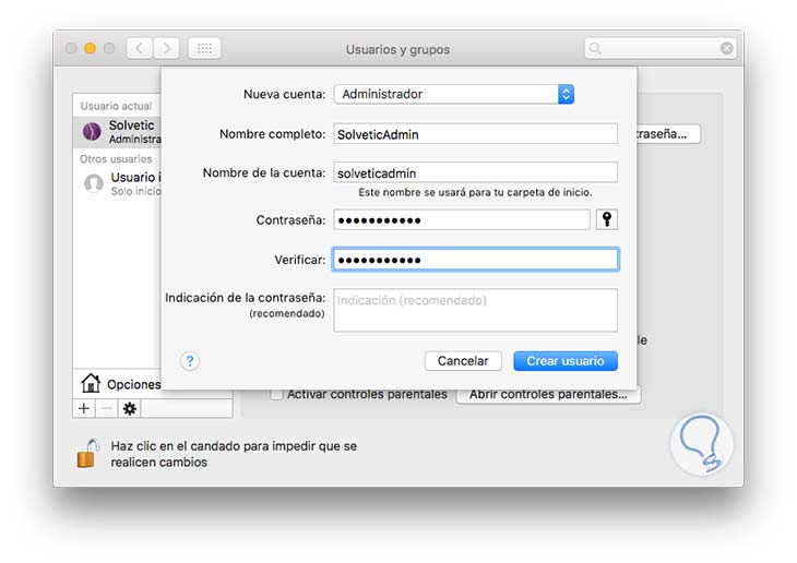 Una vez habilitemos los cambios pulsamos el ícono + para crear el nuevo usuario e ingresamos los daros del nuevo usuario teniendo presente seleccionar la opción Administrador en el campo Nueva cuenta (Por defecto está como Estándar)